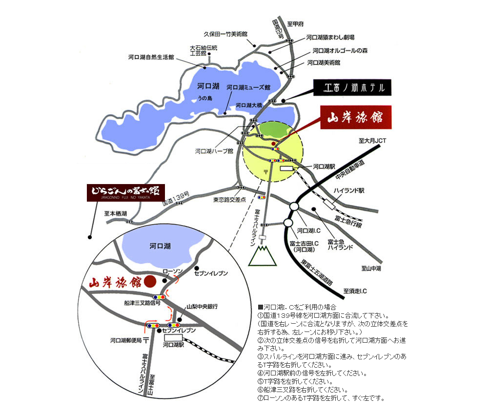 - ■新宿 100km(1時間20分)⇒河口湖I.C 3km(5分)⇒山岸旅館